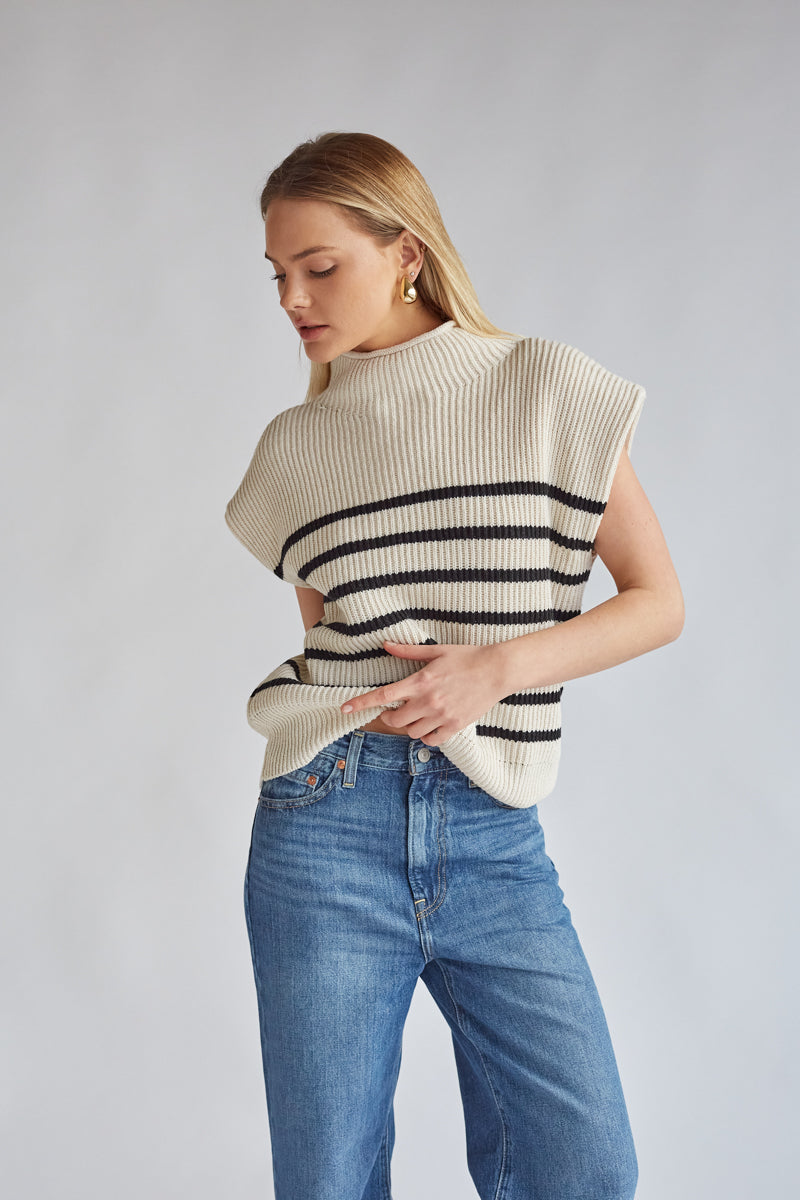 Achieve a classy and refined look in the Amari Mock Neck Sleeveless Sweater Top! This chic knit top is made of a ribbed knit material and features a horizontal striped design, mock neckline, and a sleeveless bodice. Pair with some to complete the look!