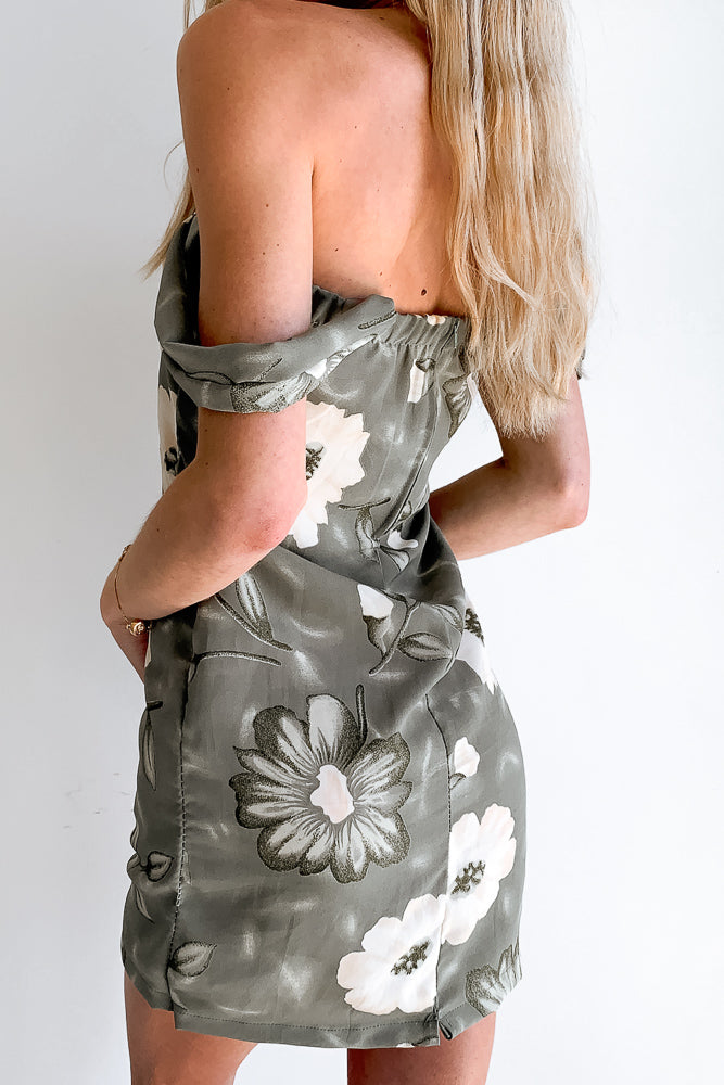 Dance the night away in the Angela Vintage Off Shoulder Mini! This mini dress features an a-line silhouette, off the shoulder sleeves, cinched front, and a sweetheart neckline. Comes in a vintage green and white floral print.