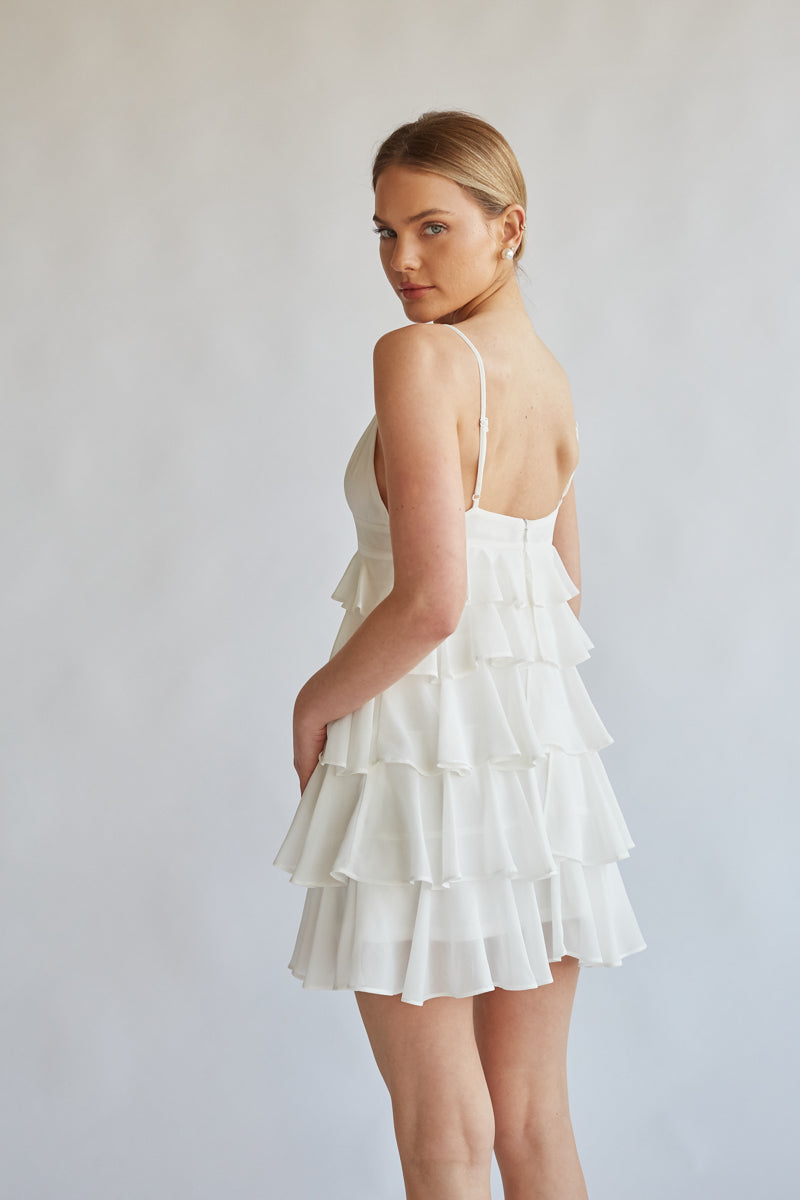 Warm sunny days just got a whole lot better with the Aria Tiered Ruffle Mini Dress! This girly dress features a v neckline, pleated waistband, and a tiered ruffle skirt. Available in azalea, black, and white. Pair with your favorite dainty for the perfect summer look!
