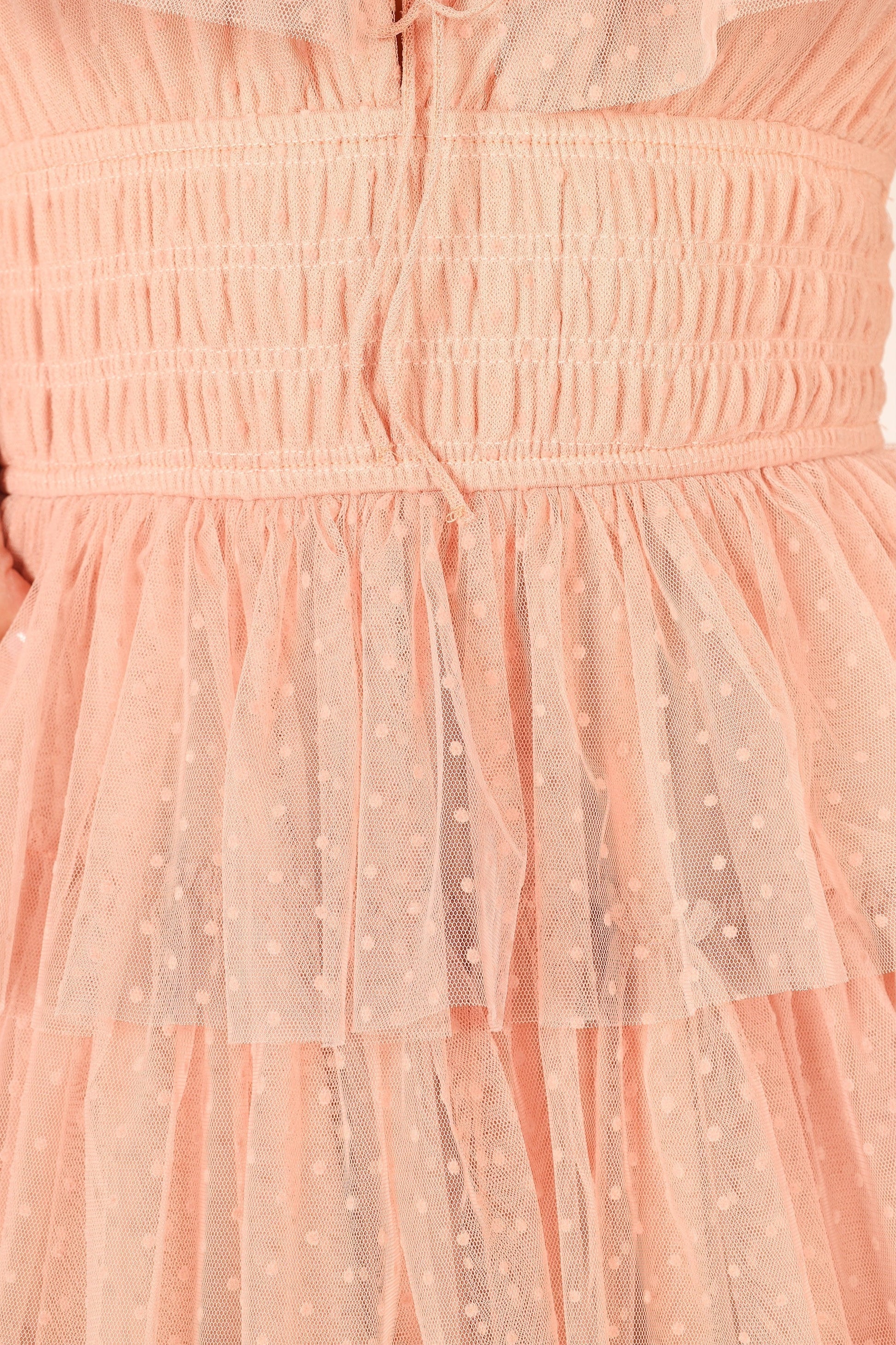 Be the belle of the ball in this stunning tulle maxi dress! Featuring a square neckline with tie close, thin elasticised straps with ruffle detail and a front cut out on the bust, this dress is sure to turn heads.