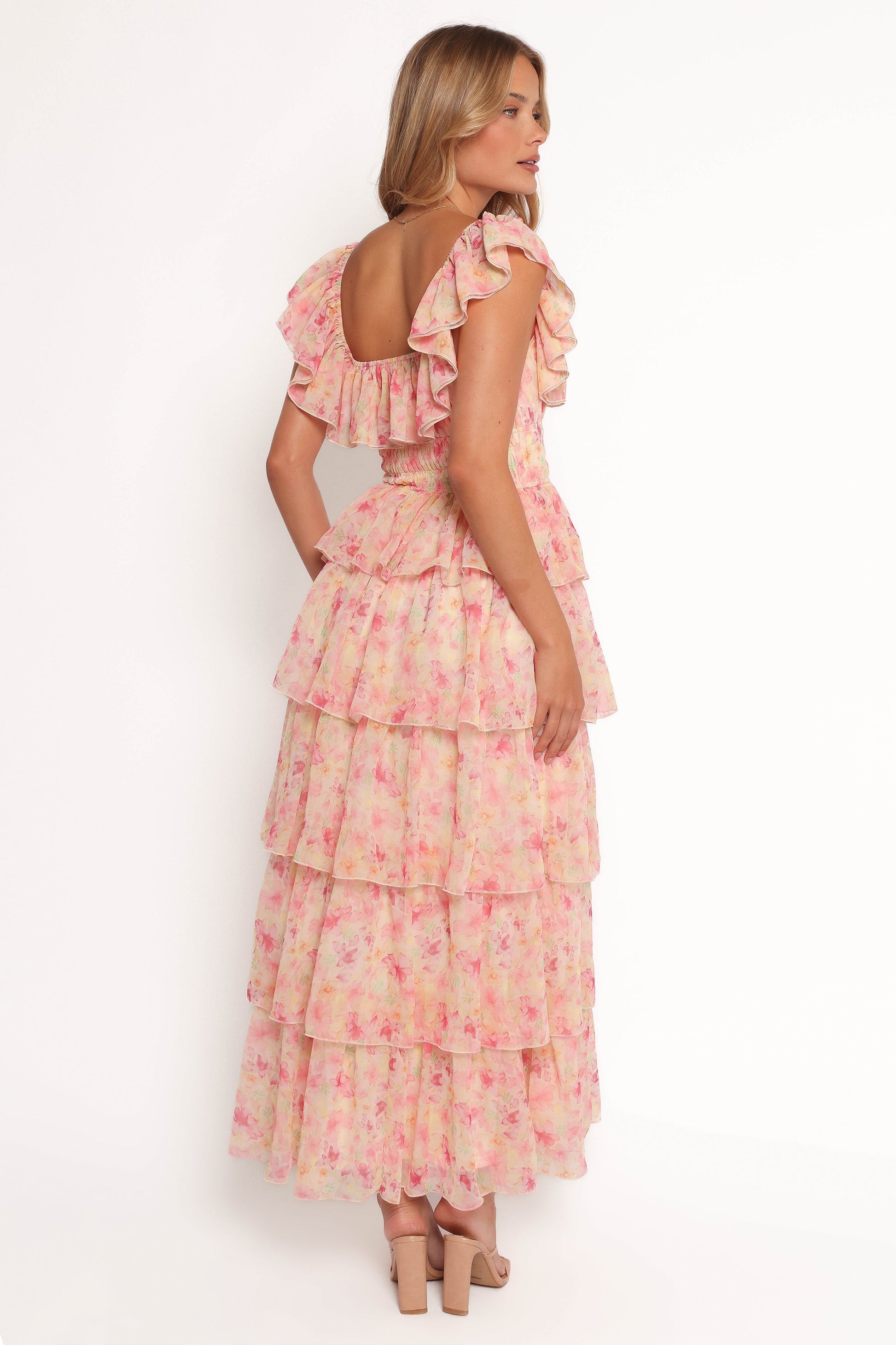 Be the belle of the ball in this stunning maxi dress! Featuring a square neckline with tie close, thin elasticised straps with ruffle detail and a front cut out on the bust, this dress is sure to turn heads.
