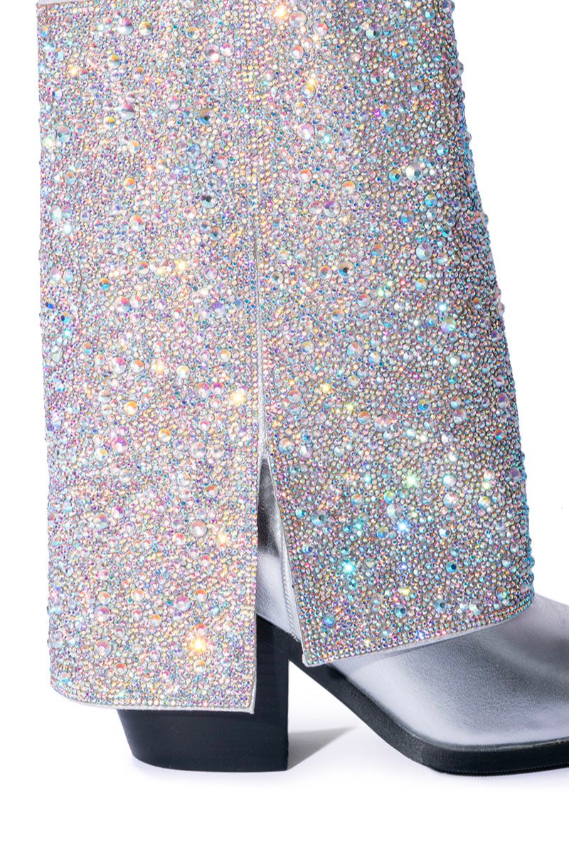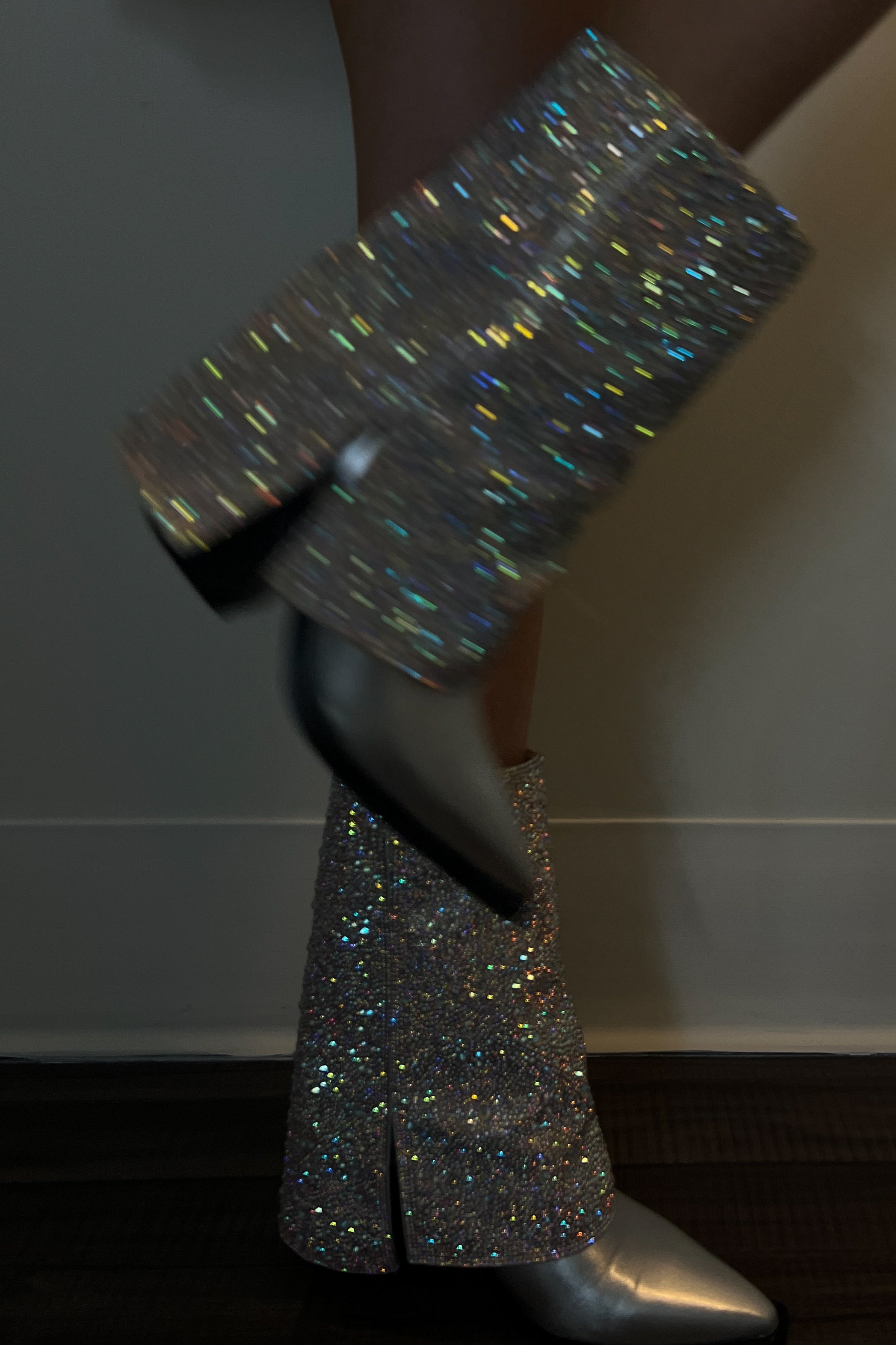 The Azalea Wang Annabelle Silver Western Boots feature a silver metallic upper, a rhinestone-embellished fold over shaft with split hems, and a pull-on design. Pair with the for a glam, Western-inspired moment!