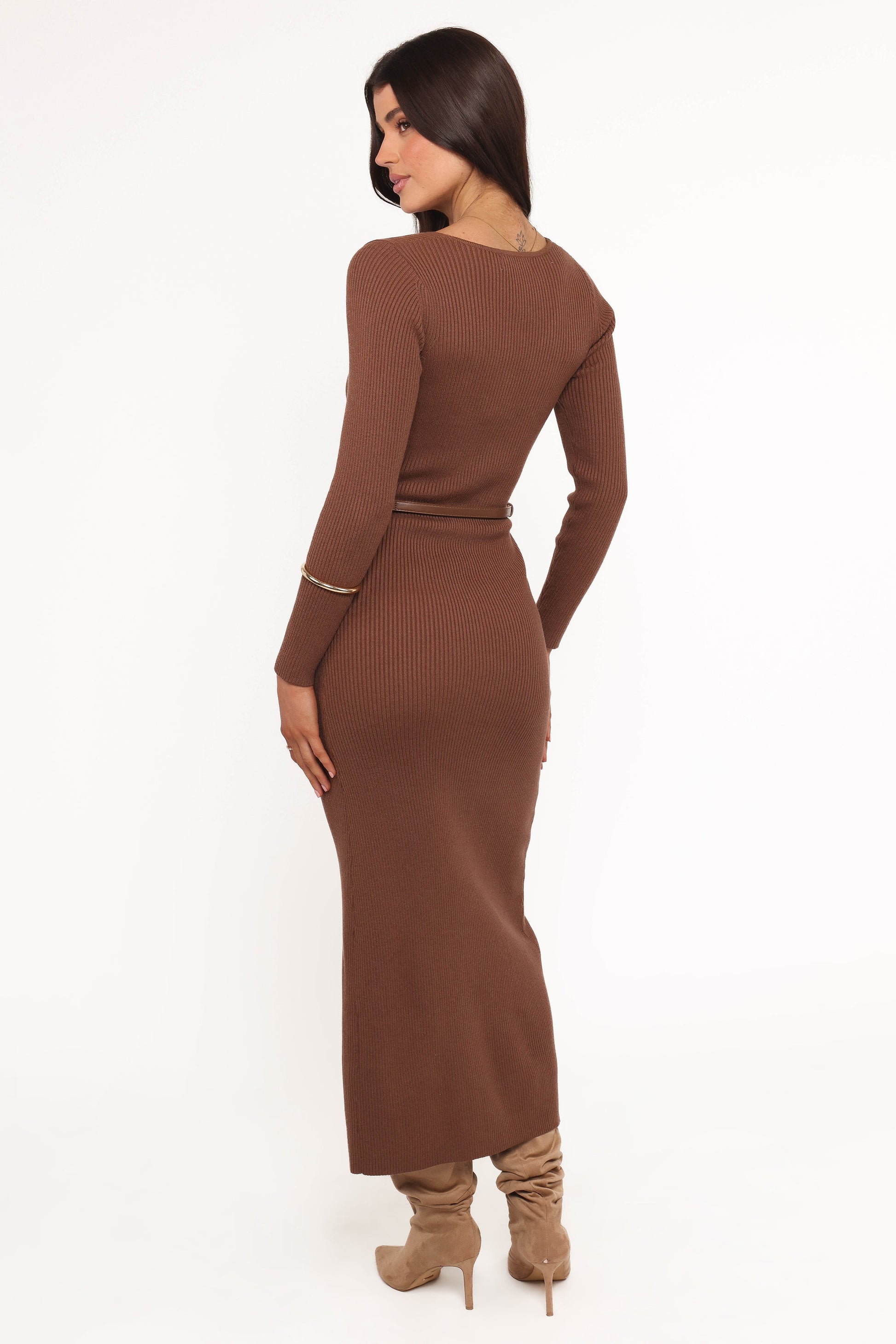 Embrace effortless elegance with the Brydie Long Sleeve Midi Dress in rich Chocolate Brown. This stunning bodycon piece hugs your curves in all the right places while the soft knit fabric ensures you stay comfortable from morning meetings to evening drinks.
