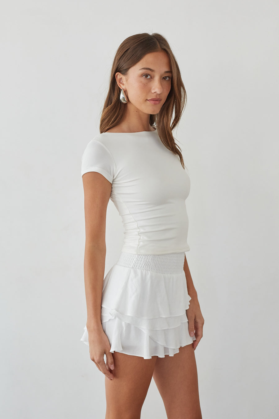 Keep it cute in the Daytona High-Rise Tiered Ruffle Skort! Featuring a high rise fit, a smocked waist, and layered ruffle detailing for a flouncy silhouette. Available in white.