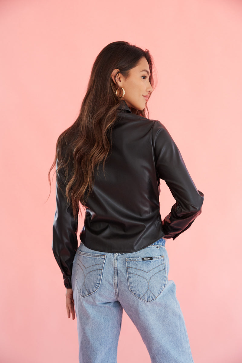 Leave them speechless in the Elaine Faux Leather Button Up Shirt! Comprised of black vegan leather, this ultra trendy top features a collared neckline and sleek ruched detailing.