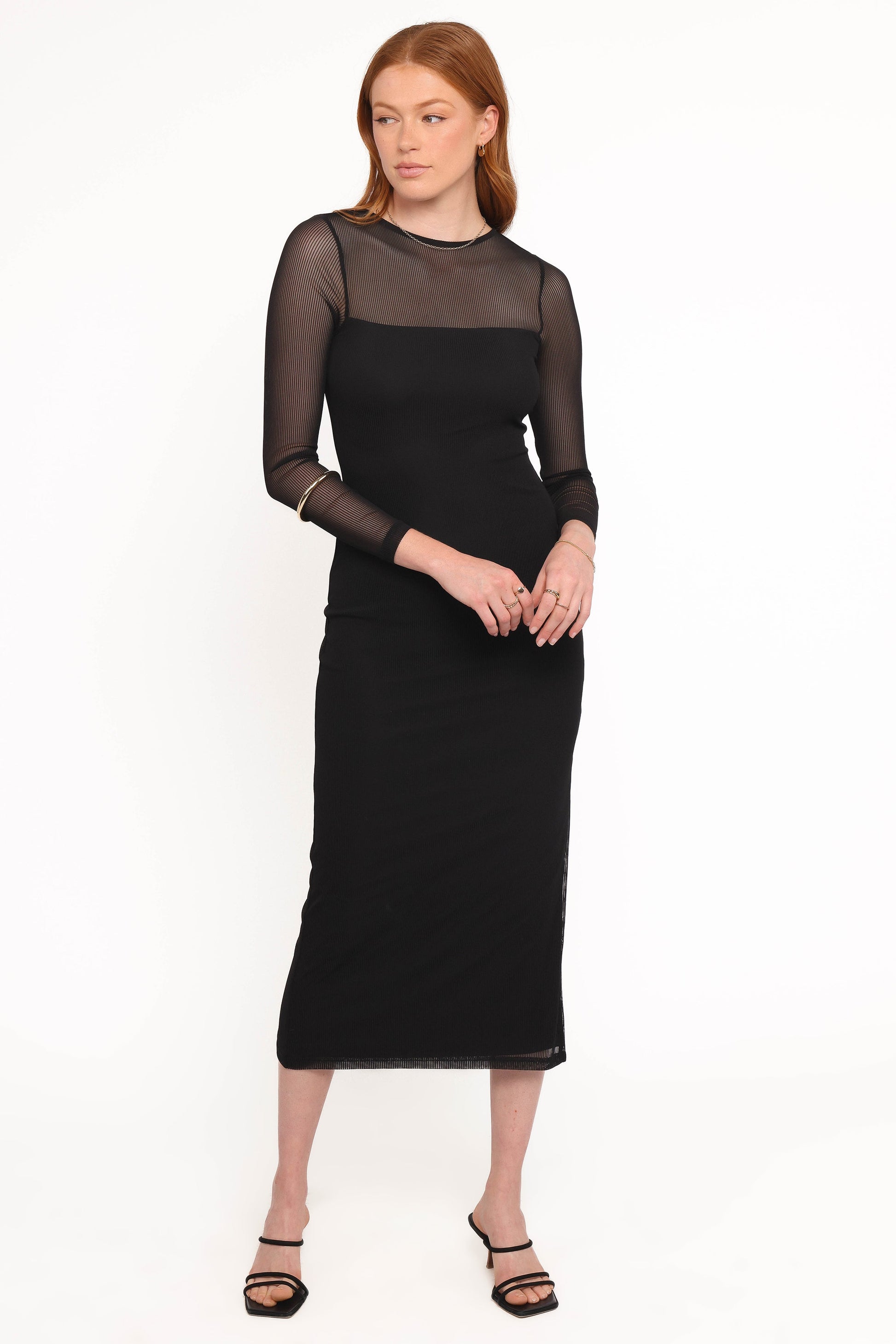 Step into your power with the Famille Midi Dress in Black, a showstopper that commands attention without saying a word. This bodycon silhouette hugs your curves in all the right places, while the sophisticated high neckline and long sleeves create an effortlessly chic look.