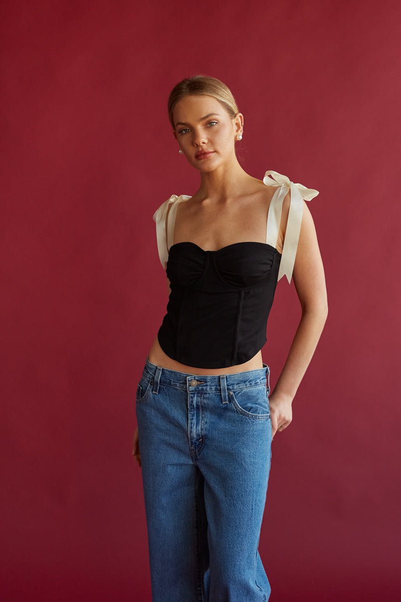 Elevate your look with the Felicity Contrast Ribbon Bustier Top! This chic top features a bustier-style bodice, contrasting ribbon shoulder straps, and boning for structure. Pair with some to complete the look!