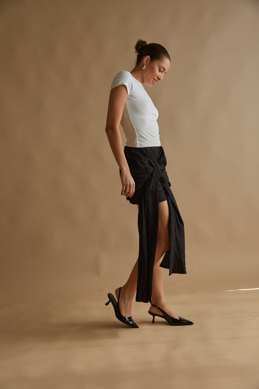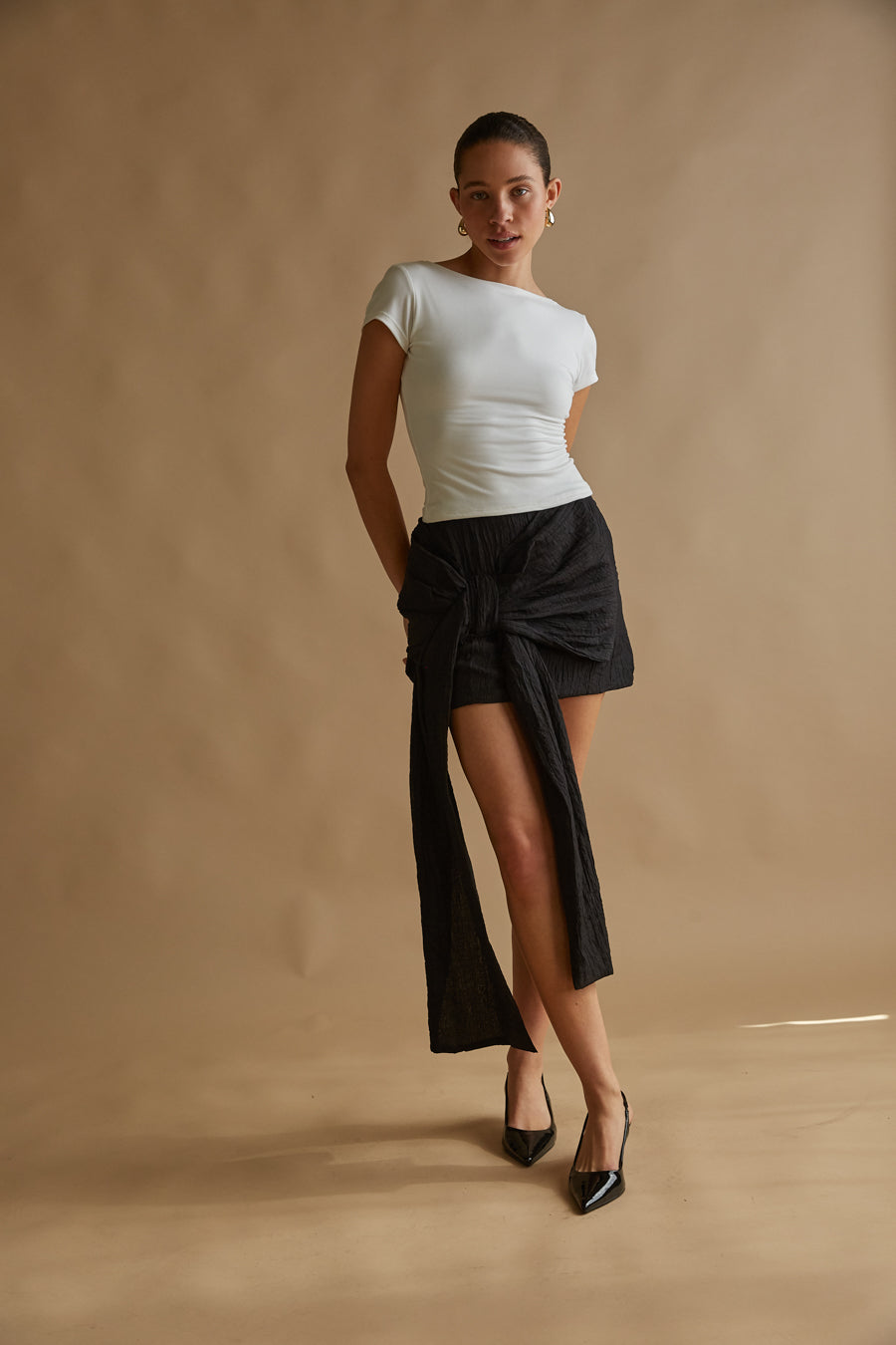 Doesn't get more chic than you in the Georgina Bow Drape Mini Skirt! This skirt is made of a crinkle texture material and features an elastic banded high waist and a statement right hip bow with a drape sash. Pair with some chic to complete the look!
