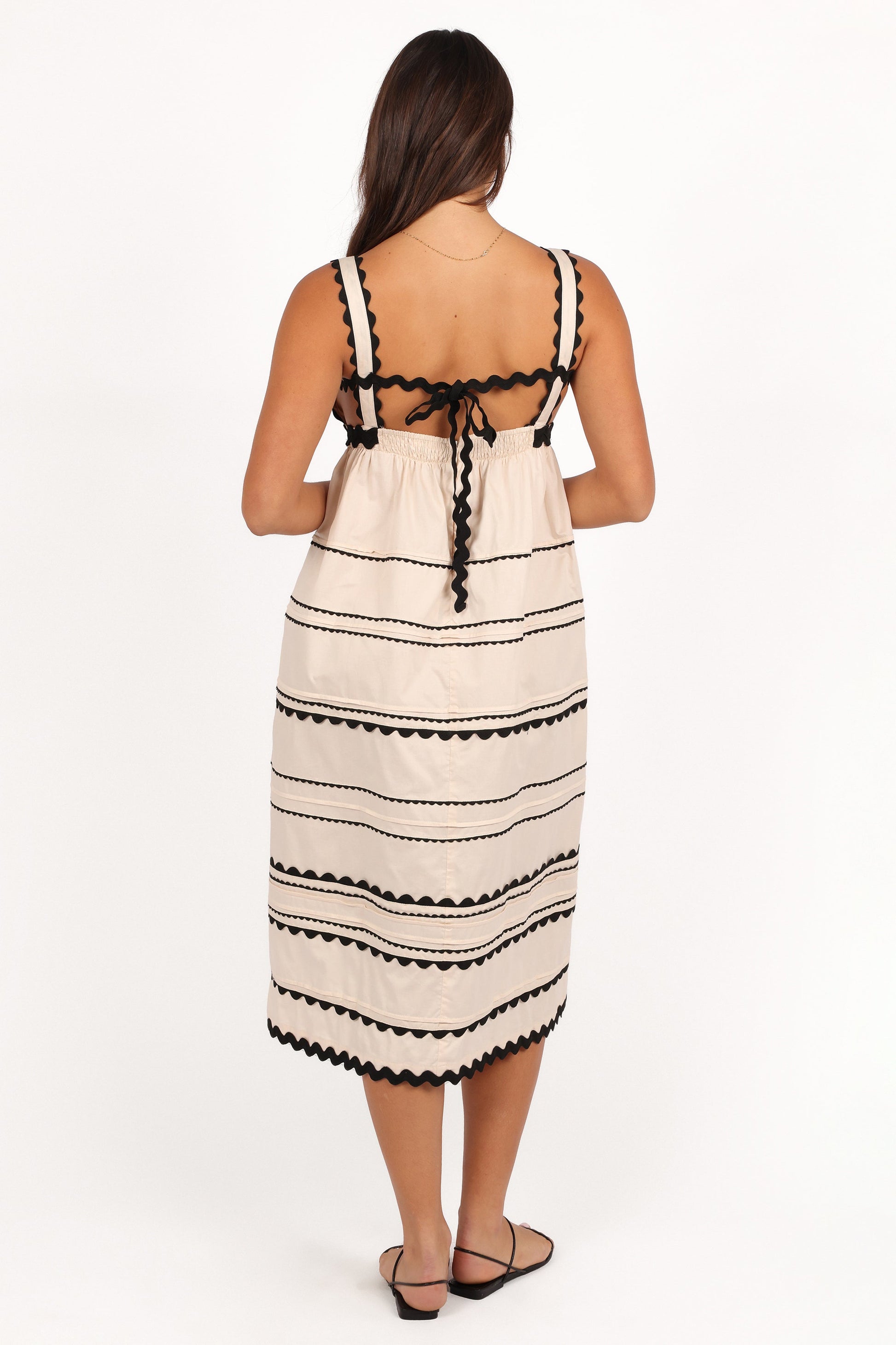 The Jeanie Midi Dress in Natural is a delightful addition to any wardrobe, effortlessly combining style and comfort. This dress features a midi length, making it versatile for both casual and more formal occasions. The flattering v-shaped neckline is complemented by non-adjustable straps adorned with charming ric rac trim.