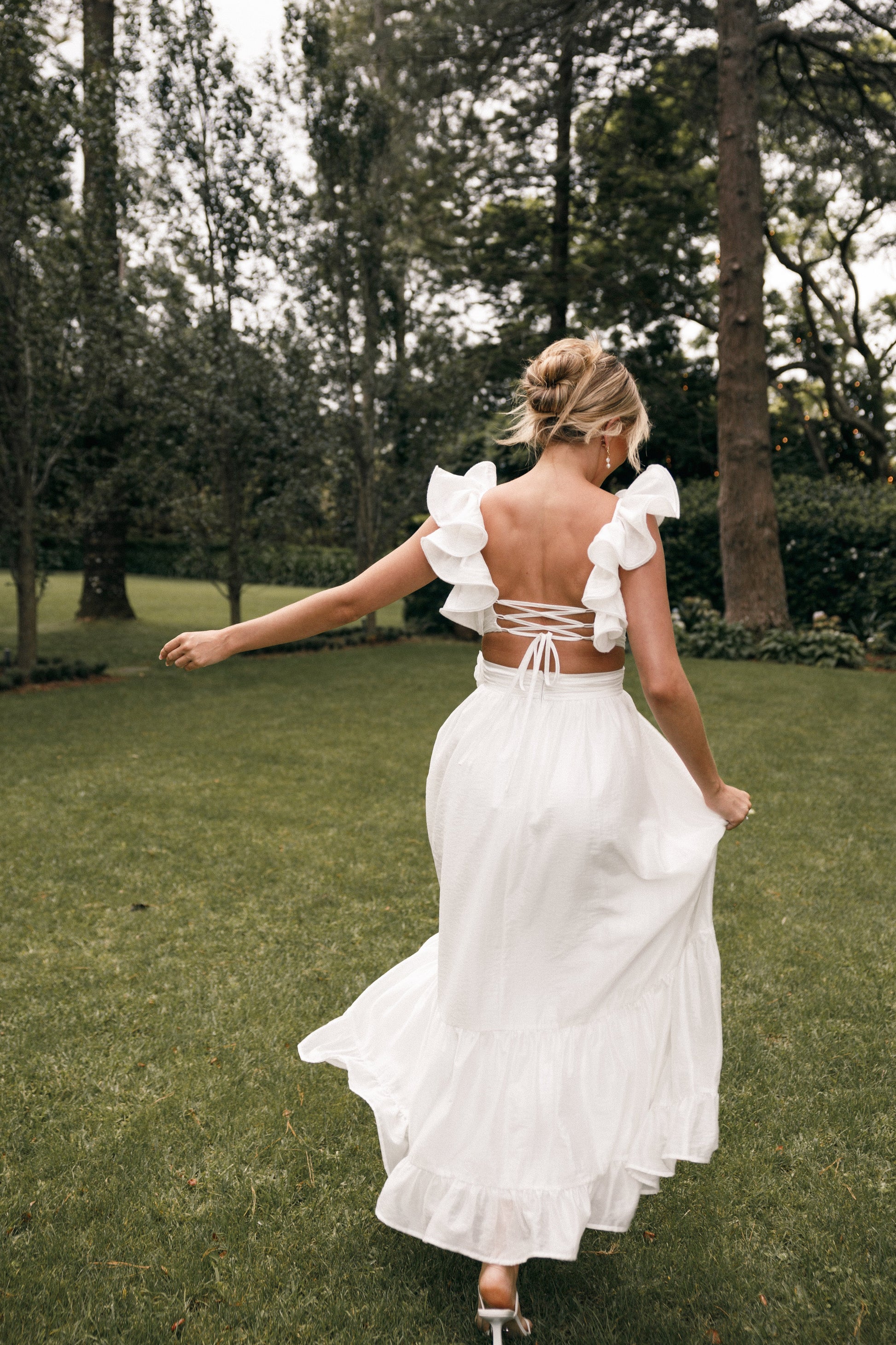 Embrace elegance with our Josey midi dress, featuring a stunning deep V neckline, chic non-adjustable straps, and beautiful ruffle detailing. Perfect for any occasion, this dress boasts an exquisite crossover back tie closure and a seamless invisible zip.