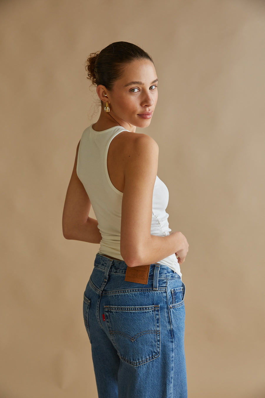The Juno ruched Ribbed Tank Top is far from basic! This twist on a classic tank is made of a ribbed material and features a high neckline, ruched sides, and a curved hem. Available in white and grey. to finish the look!