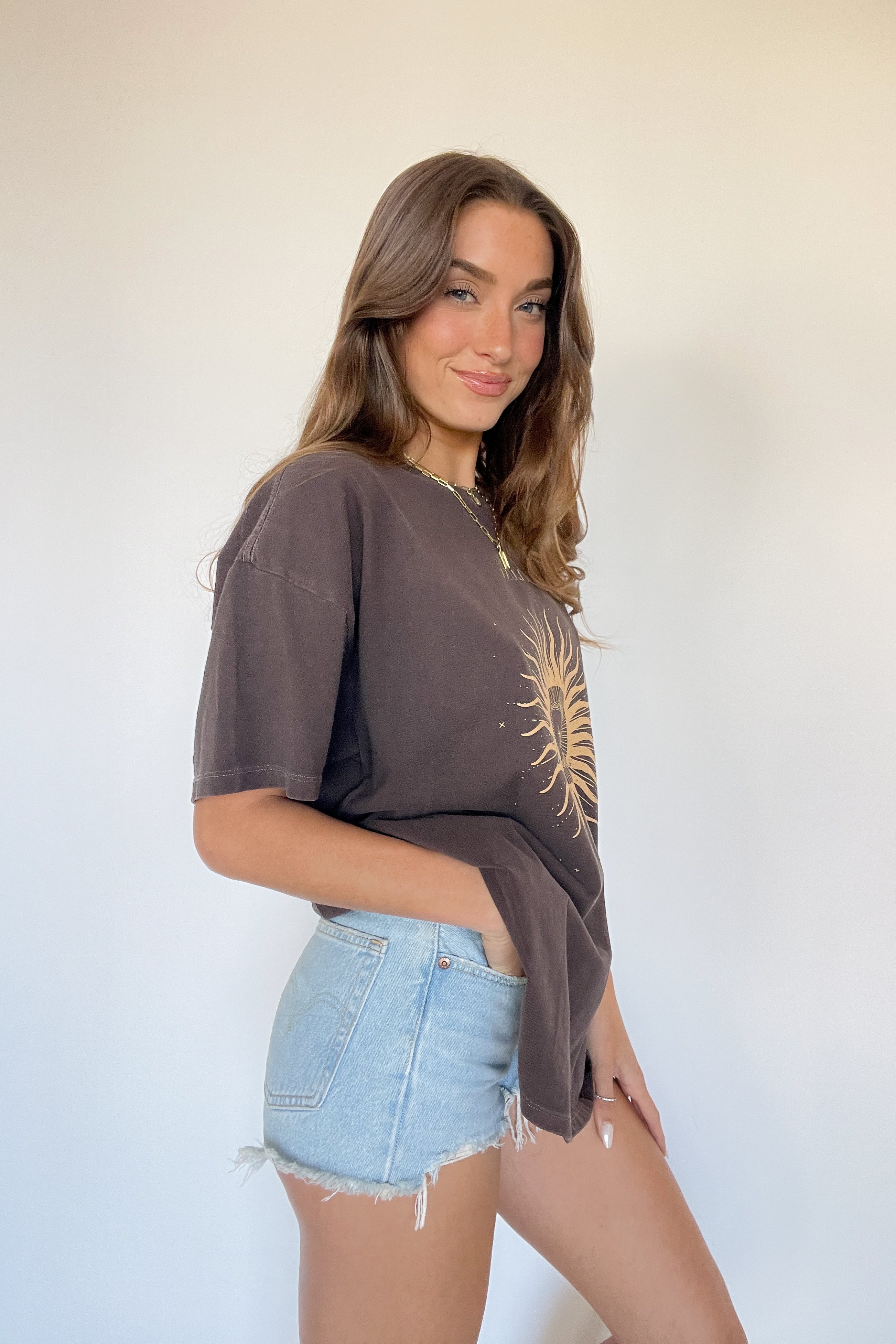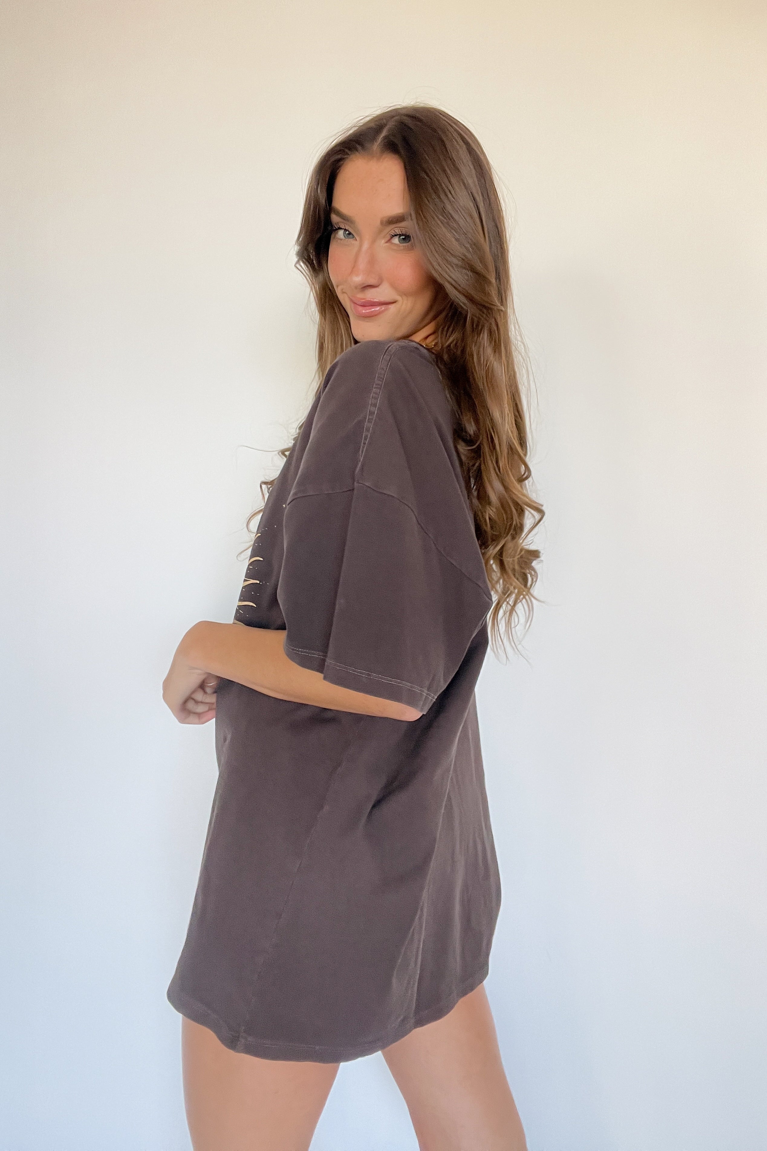 The La Luna Oversized Tee by Sunday Skin is a cozy wardrobe staple. This graphic t-shirt features an oversized fit, a boxy silhouette, distressed detailing, and a celestial graphic on the front. Available in vintage washed light grey. Style this perfect graphic tee with some for an effortlessly cool vibe.
