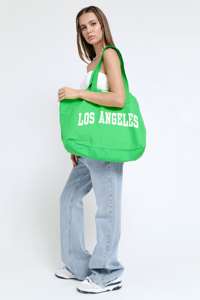 Hey babe, the Los Angeles Everyday Tote Bag is the perfect carryall. Featuring a bold kelly green canvas with white lettering. This roomy canvas tote is perfect for trips to the farmer's market! Pair with some to keep it casual. Also available in white.