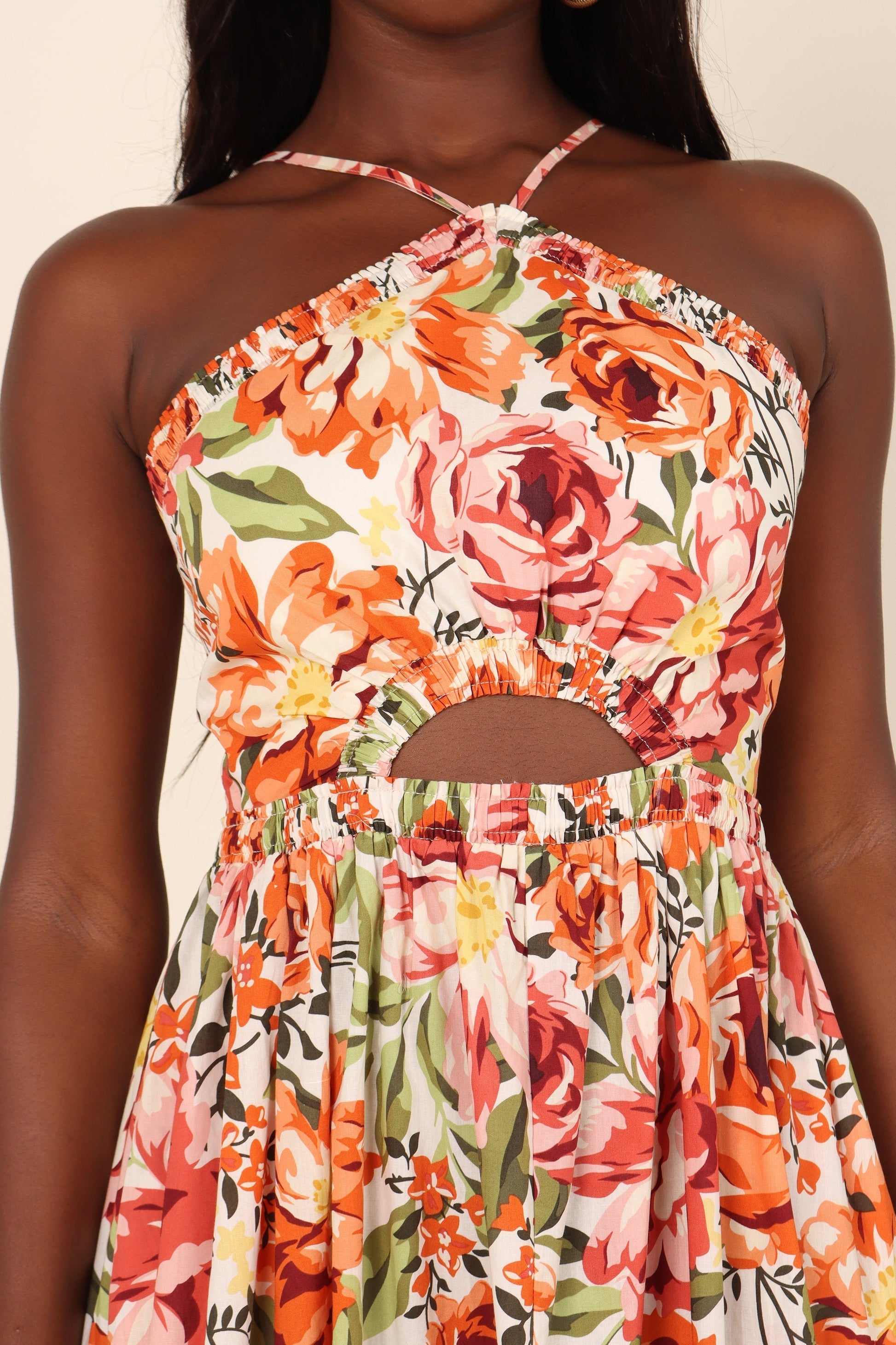 Meet our playful yet trendy Madeira Dress! With its captivating orange floral print, flirty halterneck, and cute cut-out detail under the bust, you're in for a trendy twist. Its shirred elasticised waistband and handy pockets add a dash of practicality to this fashion-forward piece.
