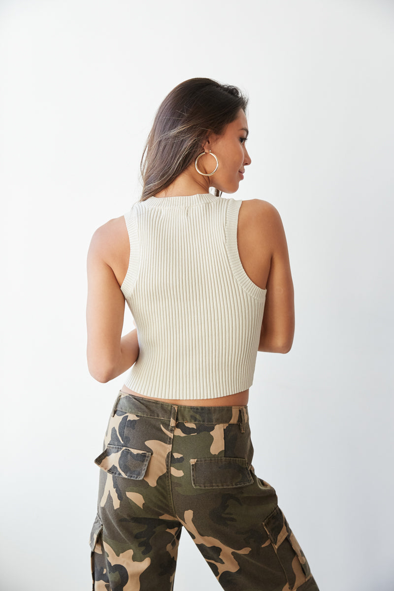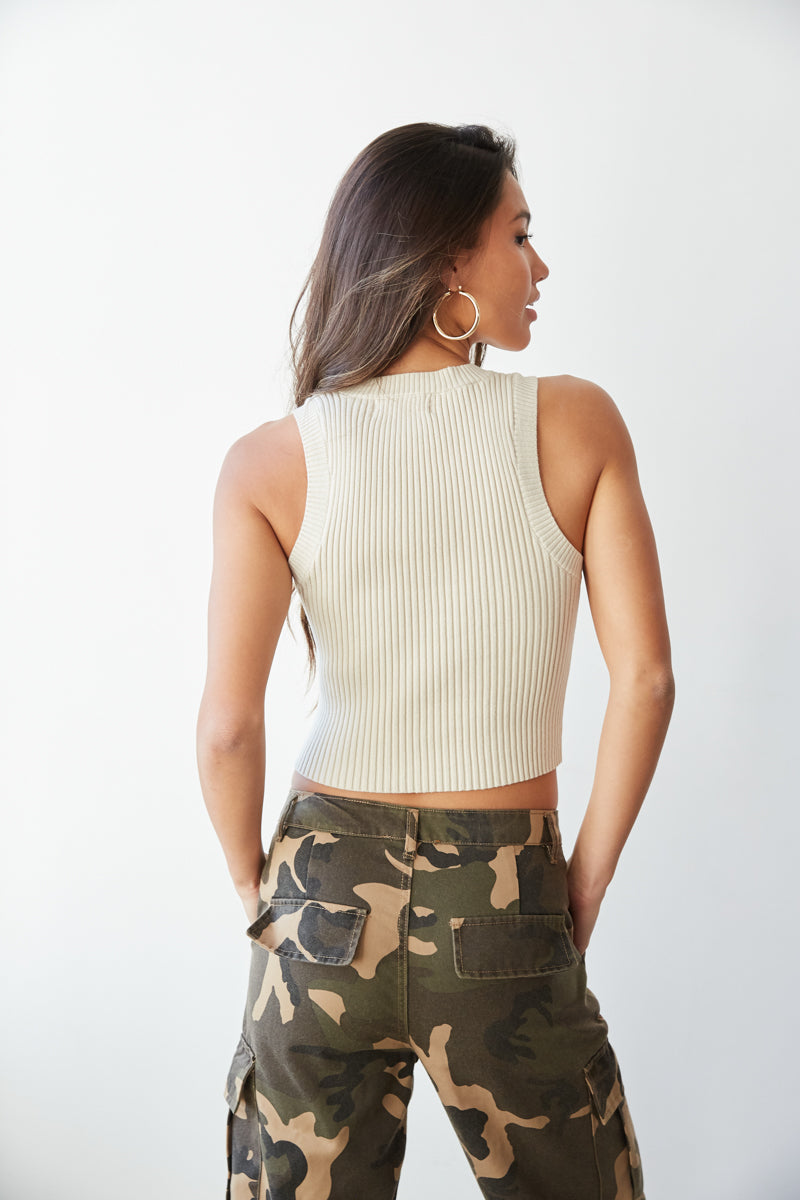 Tie together any outfit with the Norma High Neck Ribbed Top! This sleeveless top features a crew neck and cropped fit. Pair with the to complete this trendy look!