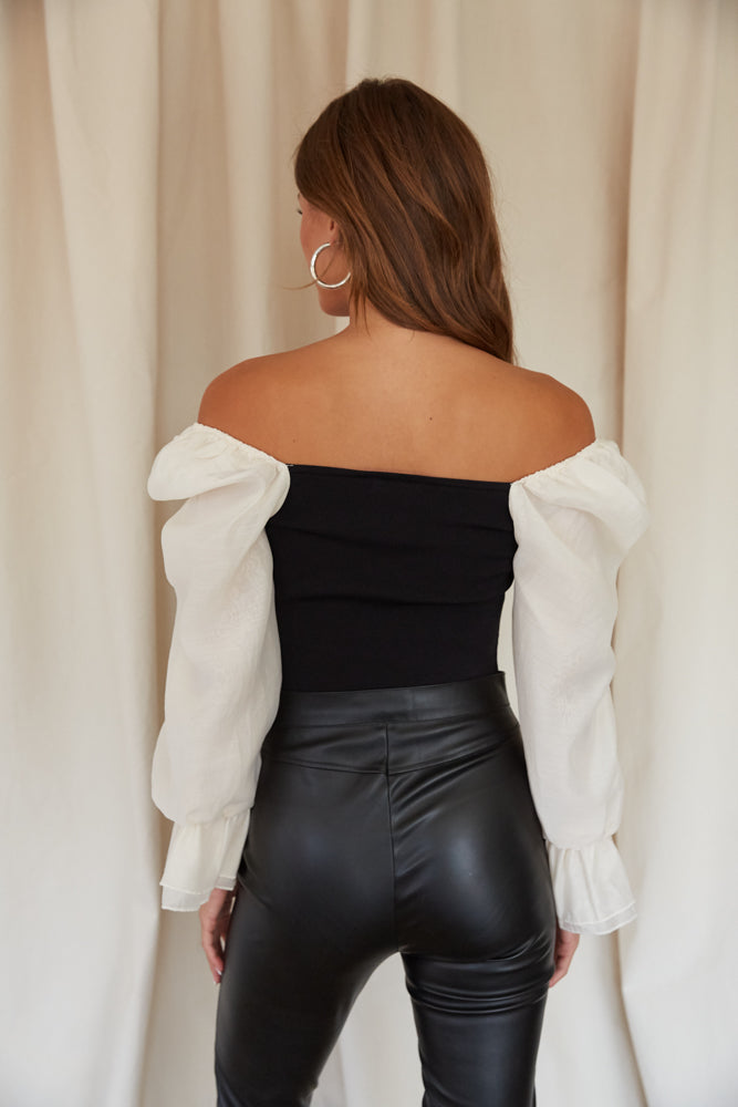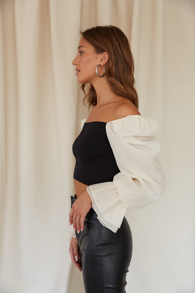 Hey babe, get ready for date night in the Paris Chiffon Puff Sleeve Contrast Top! This crop top features a black knit bodice and double-lined, cream chiffon puff sleeves with ruffle cuffs. Style the romantic sleeves on or off the shoulder. Pair with the for a stunning going out look!