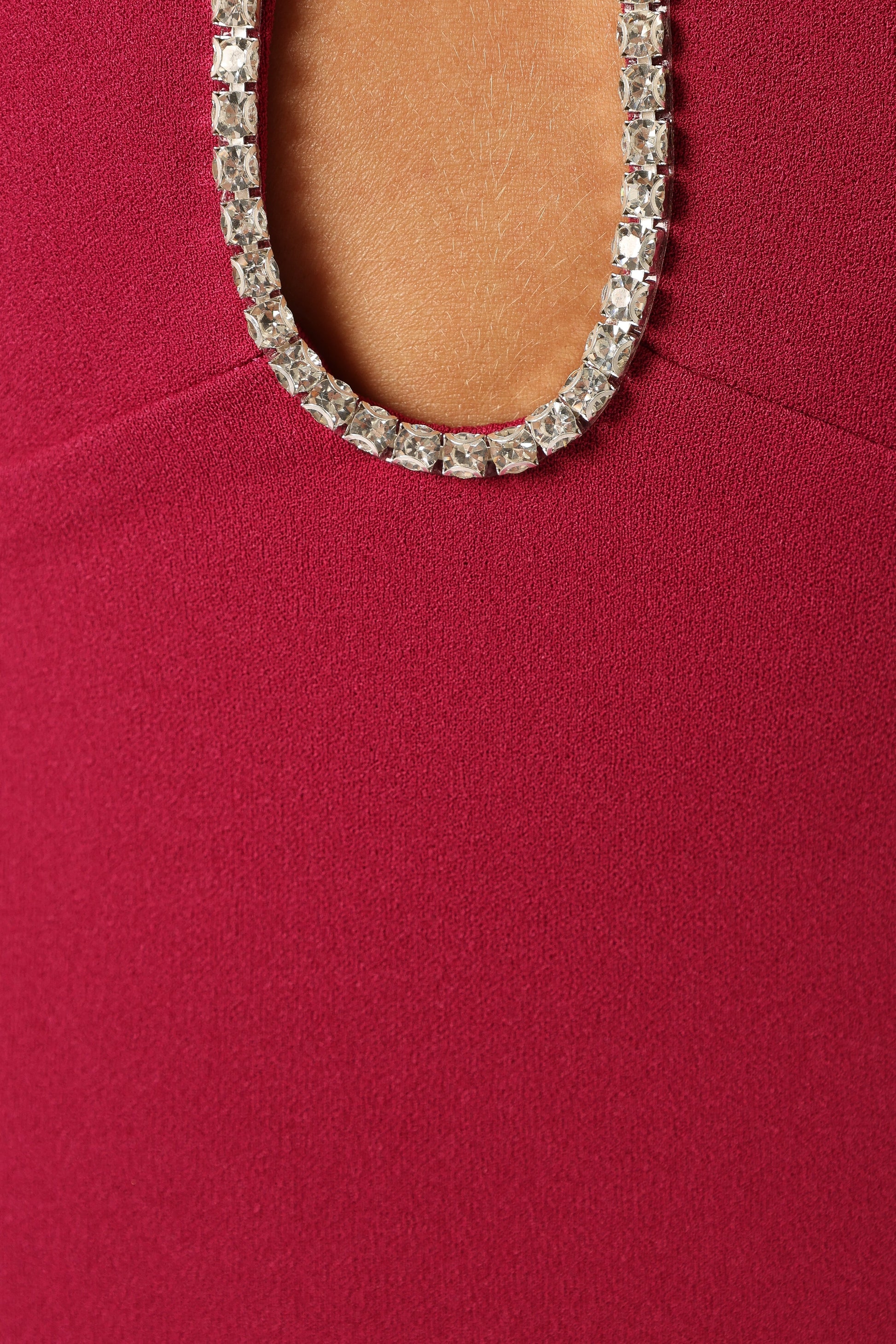Dazzle everyone in this fun and chic dress! The v-neckline and non-adjustable thin shoulder straps add a touch of sultriness while the embellished diamantes give it that show-stopping sparkle. And don't worry about getting into it - the invisible back zip with a convenient hook and clasp ensures a seamless fit.