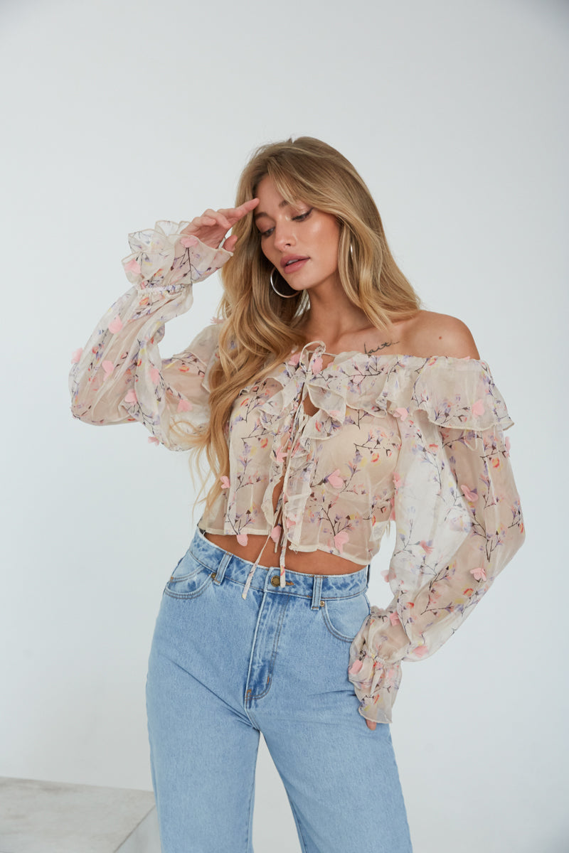 Spring is blooming, and in the Rome Off-The-Shoulder Chiffon Ruffle Top, you'll have a look to match! This stunning blouse features an open front with two adjustable tie details, floral appliqué, and a ruffled-trimmed off-the-shoulder neckline. Pair with your favorite to complete this feminine look!