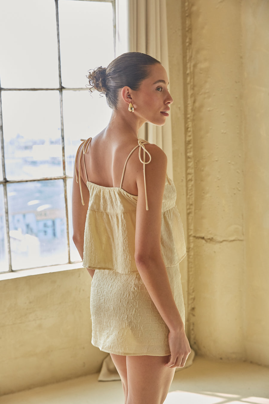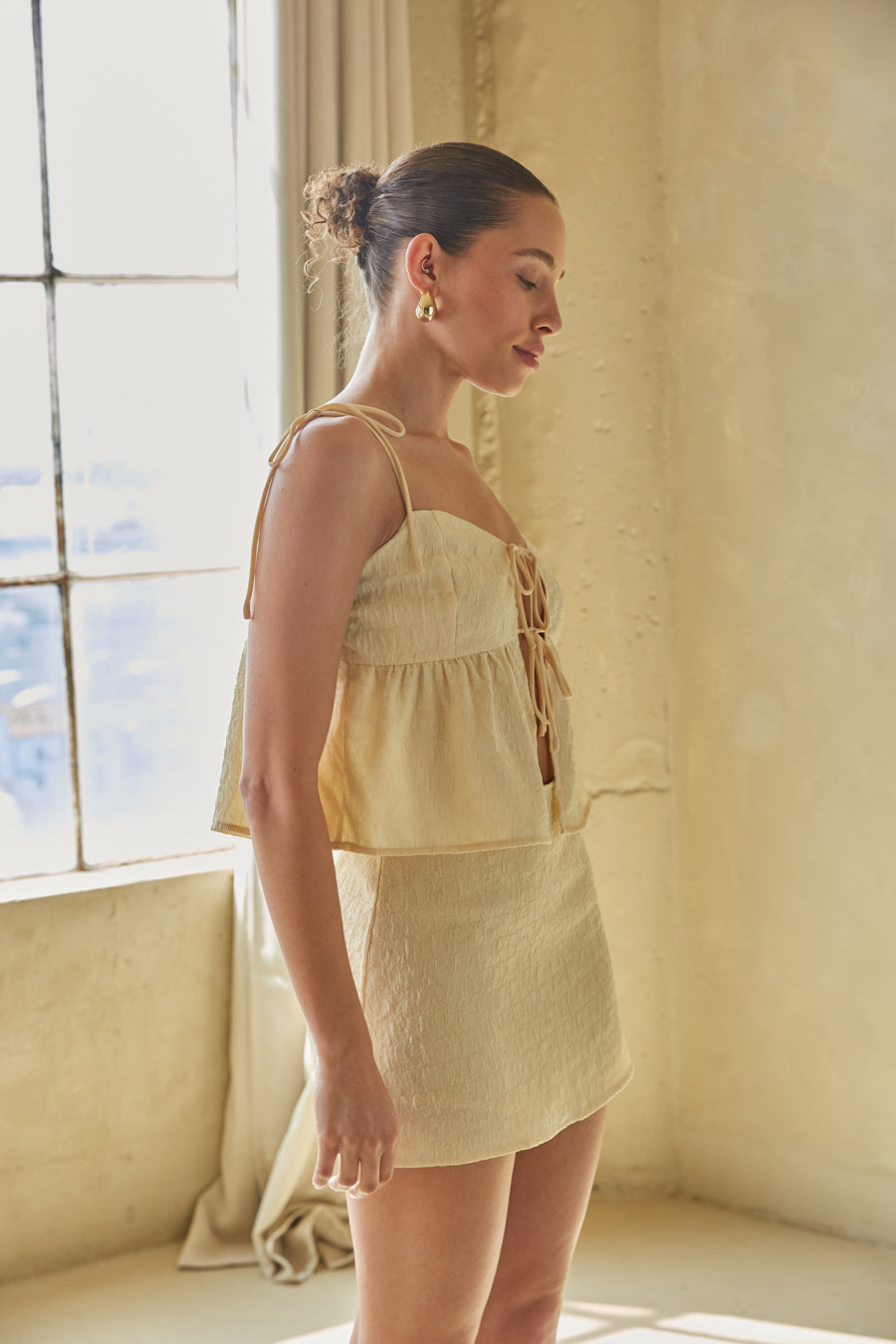 You'll look simply radiant in the Talia Textured Tie Front Top! This adorable top is made of a crinkle texture material and features an open front with two adjustable ties, a. babydoll silhouette, adjustable tie spaghetti straps, and an elastic band on the back for stretch. Pair with the matching to complete the set!
