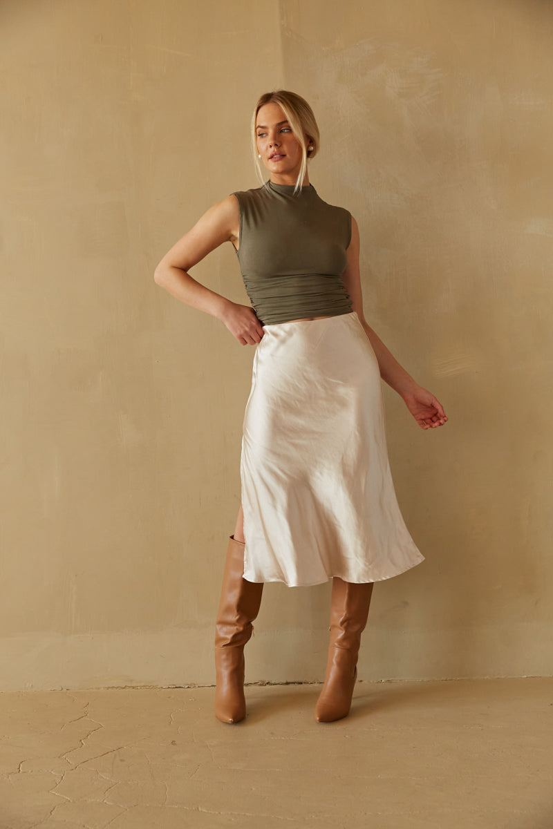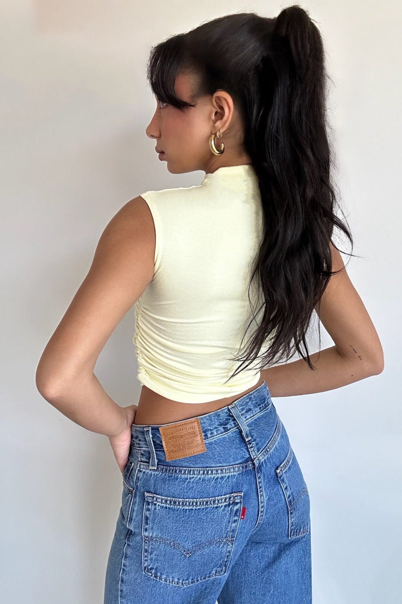It's easy to make the perfect summer outfit with the Taylor Ruched High Neck Tank Top! This cute crop top features a high neck, cutoff sleeves, and ruched sides.