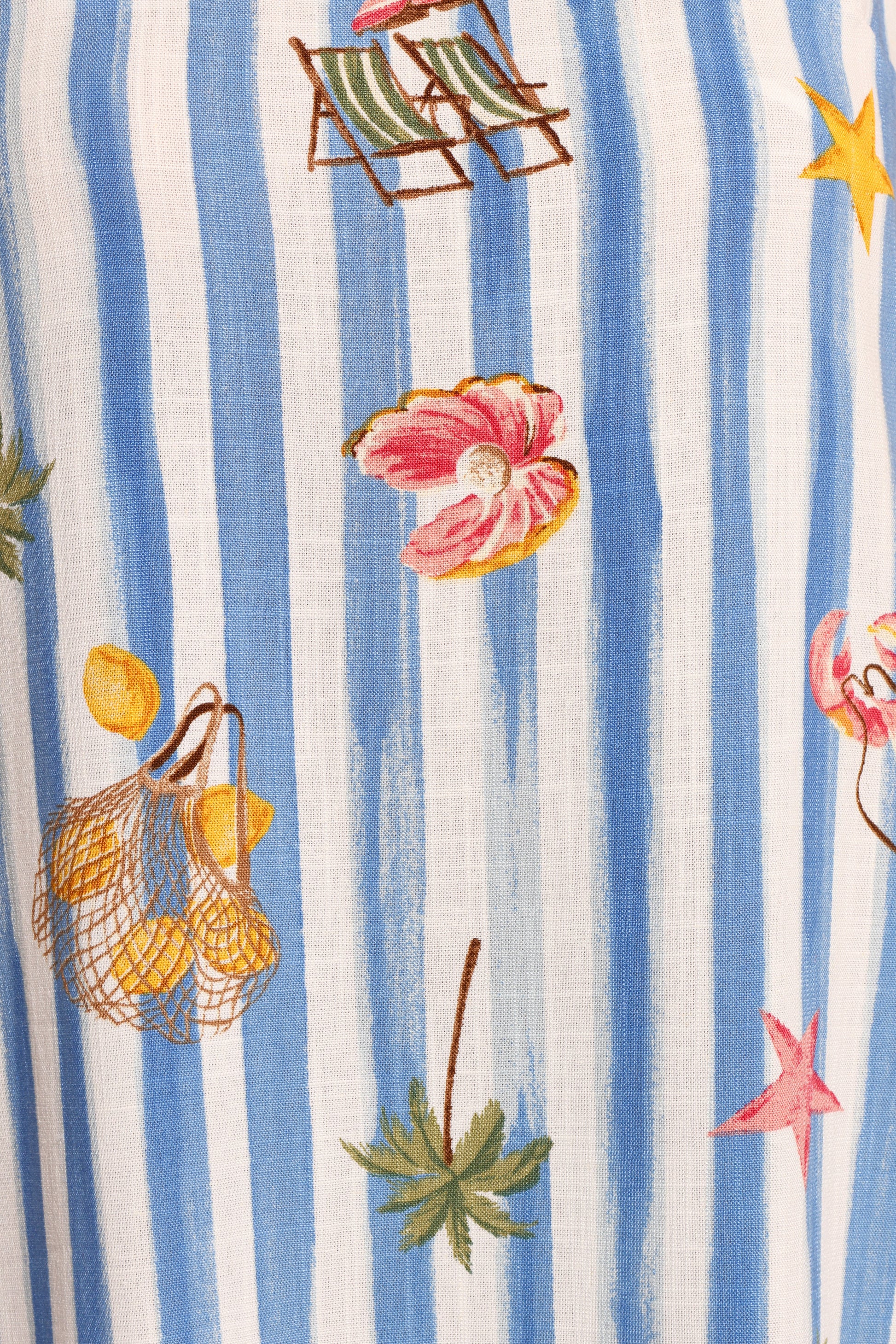 This mini dress boasts a high round neckline and sleeveless design, capturing a look that's both elegant and effortlessly cool. With its vibrant vacation inspired print, it transports you to a sun-drenched beach, adding a splash of Mediterranean flair to your wardrobe.